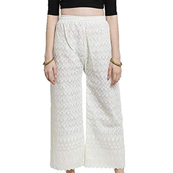 - Casual Cotton Chikan Palazzo With Broad elasticated waistband . Stretchable from 28 inches to 44 inches.