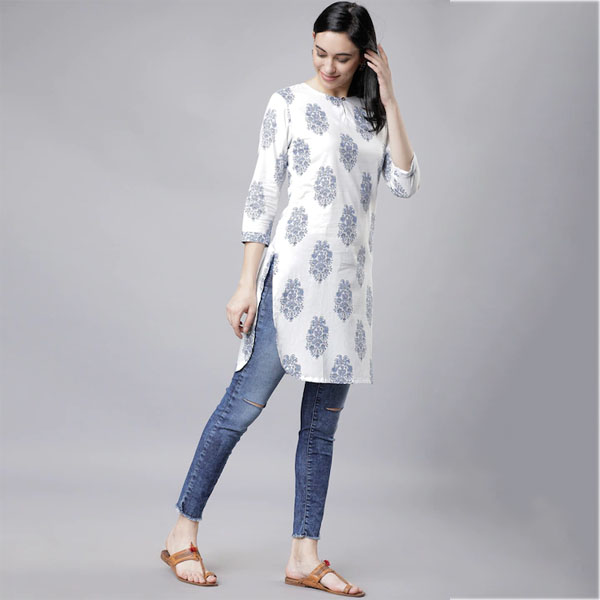 • Blue and white paisley printed tunic, has a round neck with tie-up detail, three-quarter sleeves, lace inserts detail and flounce hem